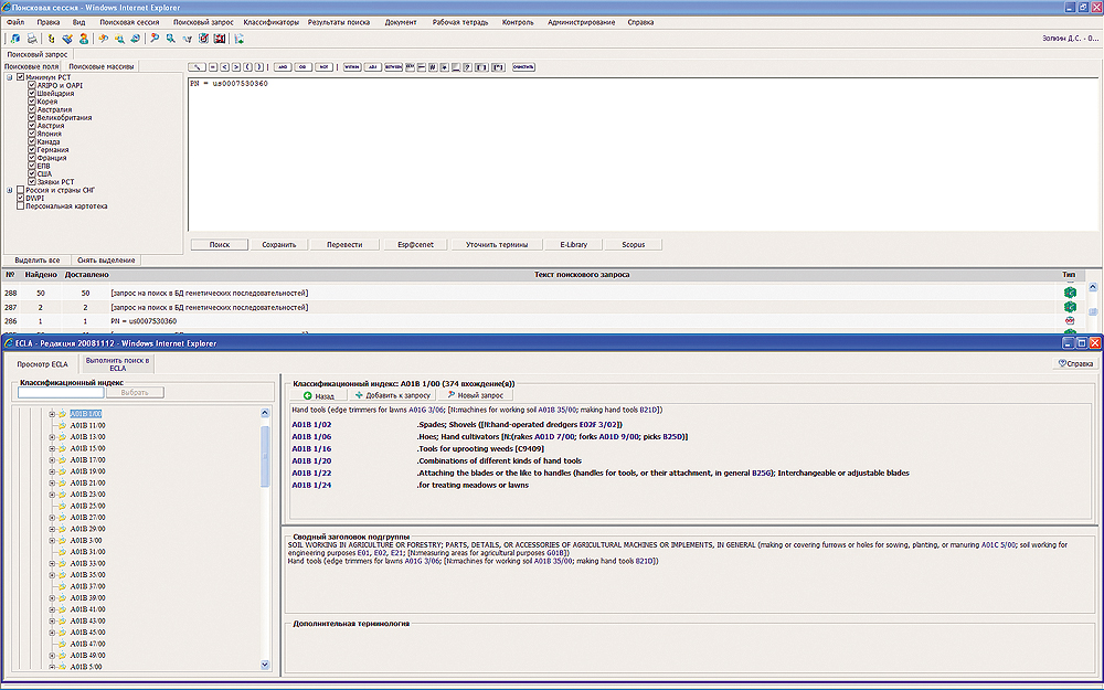 The main tool for carrying out of the searches during the examination process was the internal search system PatSearch installed on the working stations of all examiners. It contains arrays of patent documentation of the Russian Federation and the former USSR, the CIS countries, DB DWPI, as well as arrays of the foreign patent documents included in the PCT minimum documentation. The system PatSerach allows to search non-patent literature at the official site of Scientific Electronic Library RFFI and in the abstract database SCOPUS.