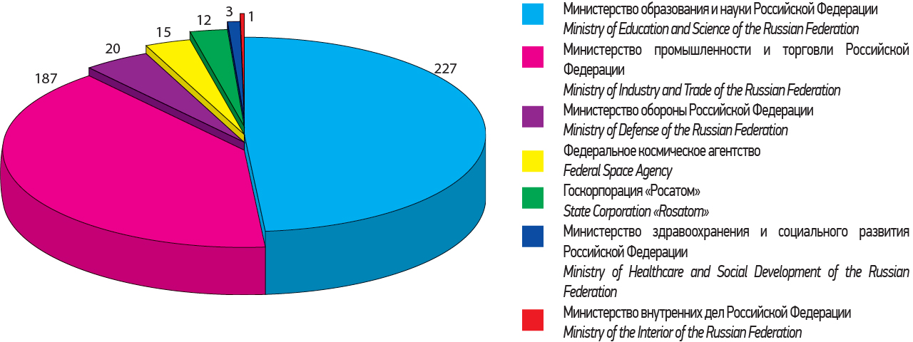 FGUP — 11, ОАО — 7, Institution of VPO– 5, State Corporation– 1, Research and Production Complex– 1, NII — 1, Institution of RAN — 1, Institution of RAMN — 1, Federal Agencies — 2 |