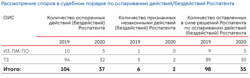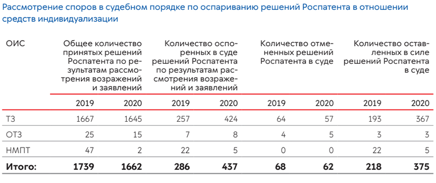 В 2020 году в судебном порядке по основаниям, связанным с неправильным применением Роспатентом норм действующего законодательства, были признаны недействительными 62 решения Роспатента, принятых по результатам рассмотрения возражений в отношении средств индивидуализации, что составляет 3,7% от общего количества принятых Роспатентом по результатам рассмотрения возражений решений в отношении указанных объектов интеллектуальной собственности.