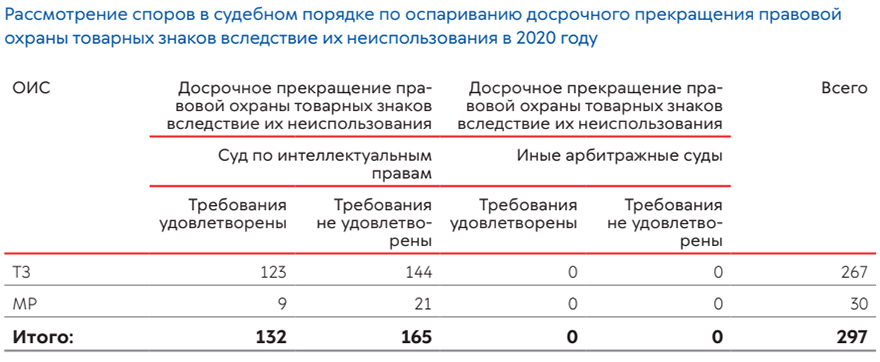 Анализируя судебную практику с участием Роспатента в 2020 году, нельзя не учитывать большое количество дел о досрочном прекращении правовой охраны товарных знаков вследствие их неиспользования. Роспатент привлекается к участию в этой категории дел в качестве третьего лица, не заявляющего самостоятельных требований относительно предмета спора. Сведения о количестве рассмотренных судами дел данной категории приведены в таблице 5 .