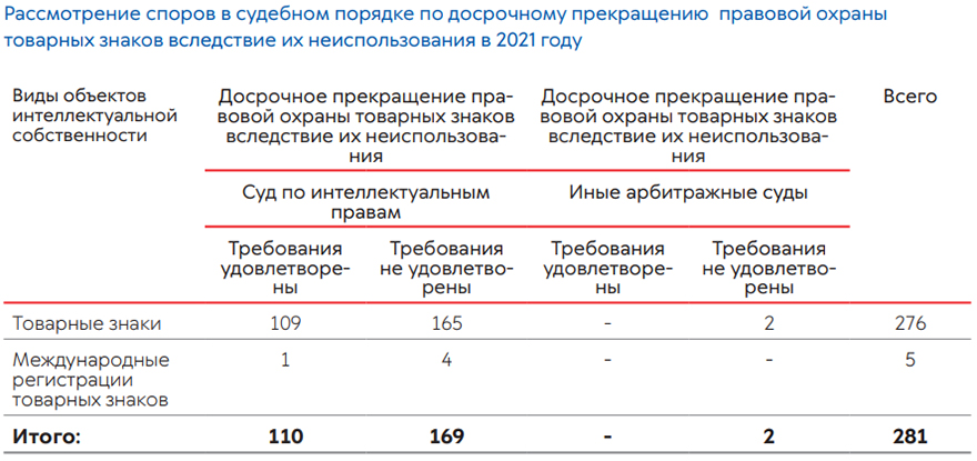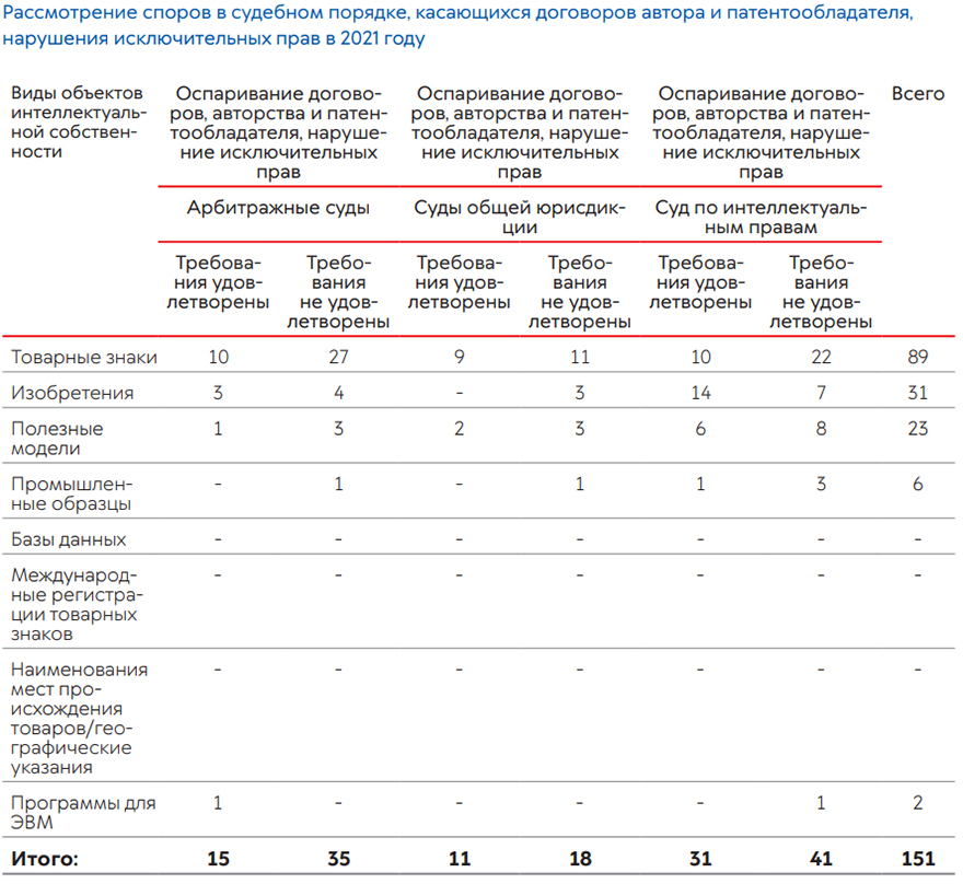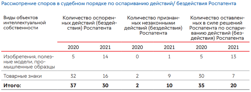 В 2021 году в судебном порядке признаны недействительными 78 решений Роспатента, принятых по результатам рассмотрения возражений в отношении средств индивидуализации. В отношении объектов патентных прав в судебном порядке признаны недействительными 17 решений.
