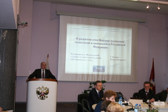 Руководитель Роспатента Б.П. Симонов выступил с приветственным словом к участникам секции и с докладом «О развитии сети Центров поддержки технологий и инноваций в Российской Федерации». В докладе была представлена развернутая характеристика международного проекта и его вклад в инновационную Россию.