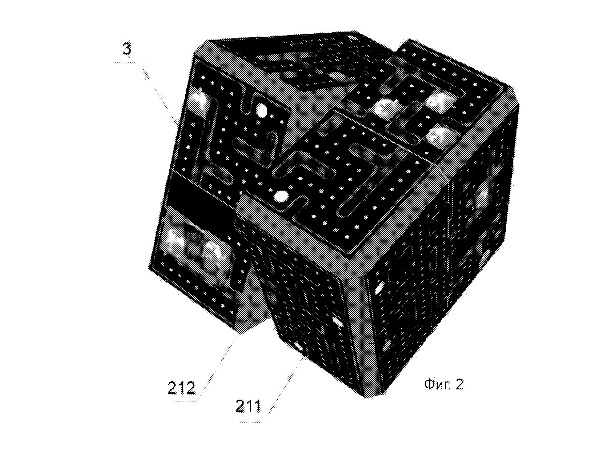 Больше всего устройство, придуманное российским инженером, похоже на знакомый всем с детства кубик Рубика. Оно представляет собой объемный трансформируемый дисплей. Вокруг центрального элемента расположено множество периферических элементов, имеющих плоские грани и выполненных с возможностью движения и поворота вокруг центрального элемента, при этом каждый из периферических элементов имеет по меньшей мере один дисплей, расположенный на внешней грани периферического элемента (см. рисунок), и расположенные на внутренних гранях указанного периферического элемента контактные группы. Устройство снабжено микропроцессором, соединенным с источником питания, расположенным внутри указанного периферического элемента.