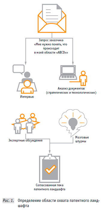 Методология ФИПС в части определения области охвата и границ патентного ландшафта предполагает организацию и проведение серии интервью, семинаров и мозговых штурмов, ориентированных на обсуждение содержания патентного ландшафта. В ходе подготовки к мозговым штурмам выполняется анализ документов как в области стратегического целеполагания, так и документов технологического содержания (технологические новости, блоги, планы исследований и разработок и пр.) (рис. 1).