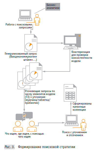 Поисковая стратегия, как правило, предусматривает создание патентных пулов по классификационному поиску и тематическому поиску с последующим отсечением нерелевантных документов (рис. 3).