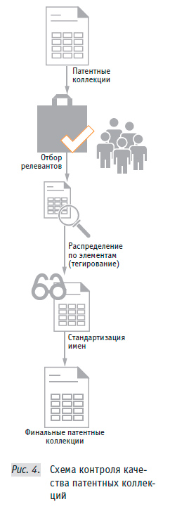 Ключевым результатом контроля качества патентной коллекции является релевантная генерализованная патентная коллекция, а также реестры стандартизованных названий организаций-патентовладельцев и авторов изобретений (рис. 4).
