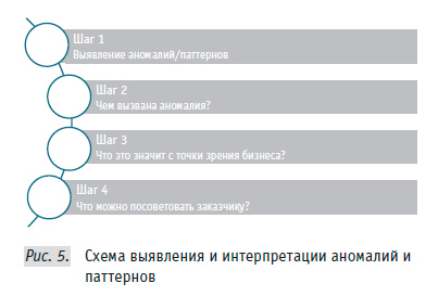 Важным результатом работ в рамках каждого экспресс патентного ландшафта является многоуровневое формирование выводов, включая выявление аномалий / паттернов, формирование гипотез и исследование причин появления аномалий, интерпретация аномалий с точки зрения бизнеса и формирование конкретных рекомендаций заказчику по реагированию на выявленные тенденции (рис. 5).
